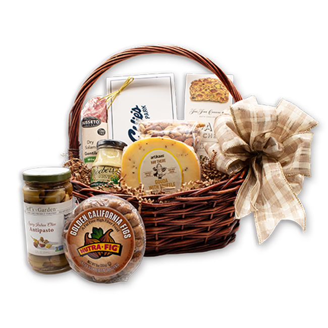 Arrangement Includes: The Fine Cheese Co. Toast for Cheese, Birnn's 18 piece Truffle Assortment, Jeff Gorden Italian Olive Antipasto, Busseto Salami, Sundried Figs, Truffle Cheese, Woeber's Reserve Champagne Dill Mustard, MD Deluxe Mixed Nuts; in a basket