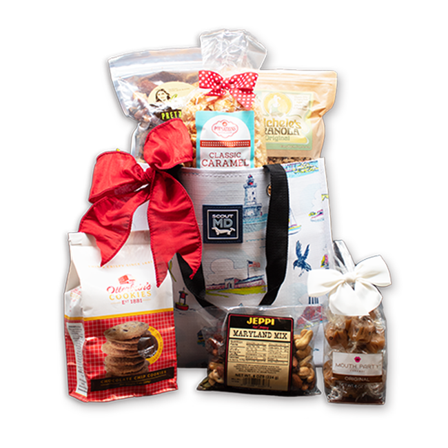 Our Best-Selling Arrangement: Popsations Classic Caramel Popcorn, Otterbein's Cookies, Mouth Party Caramels, Jeppi Nut Mix, Carey's Signature Pretzels, Michele's Granola; in a SCOUT MD Tote Bag.