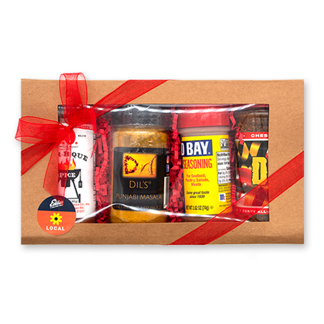 Four of Maryland’s greatest tastes in a gourmet gift pack: Todd’s Dirt Chesapeake Seafood Seasoning, J.O. Spice Company Bar-B-Que Spice, Dil’s Kitchen Premium Punjabi Masala, and Old Bay Seasoning