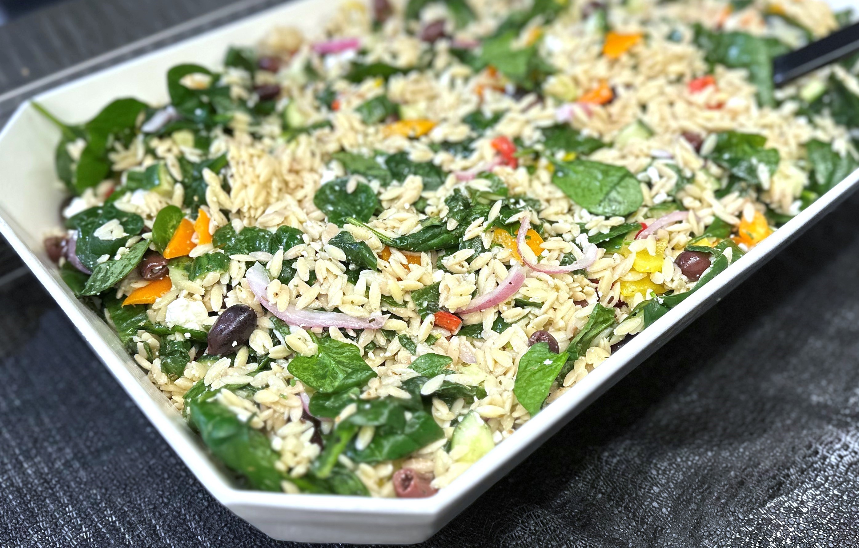 One quart orzo pasta, cucumber, olives, onion, red bell pepper, spinach and crumbled feta in a lemon dijon dressing (v)